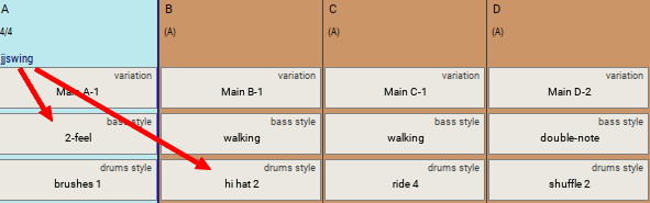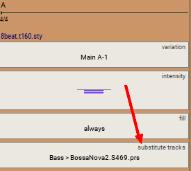 This new rhythm parameter lets you use tracks from different rhythms/styles. In the image below we override the 8beat.t160.sty bass track by a bossa-nova track.